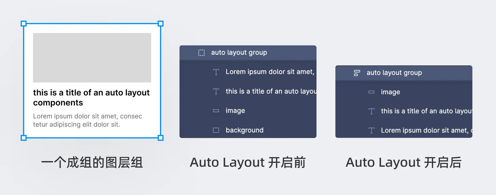 多个元素可以是一般矢量图层,也可以是文字、不同编组。需要注意的是,如果选中一个包含多个子元素的一般编组也可以启动自动布局,自动布局会移除一般编组生成自动布局编组,然后对这些下级元素进行布局排列。