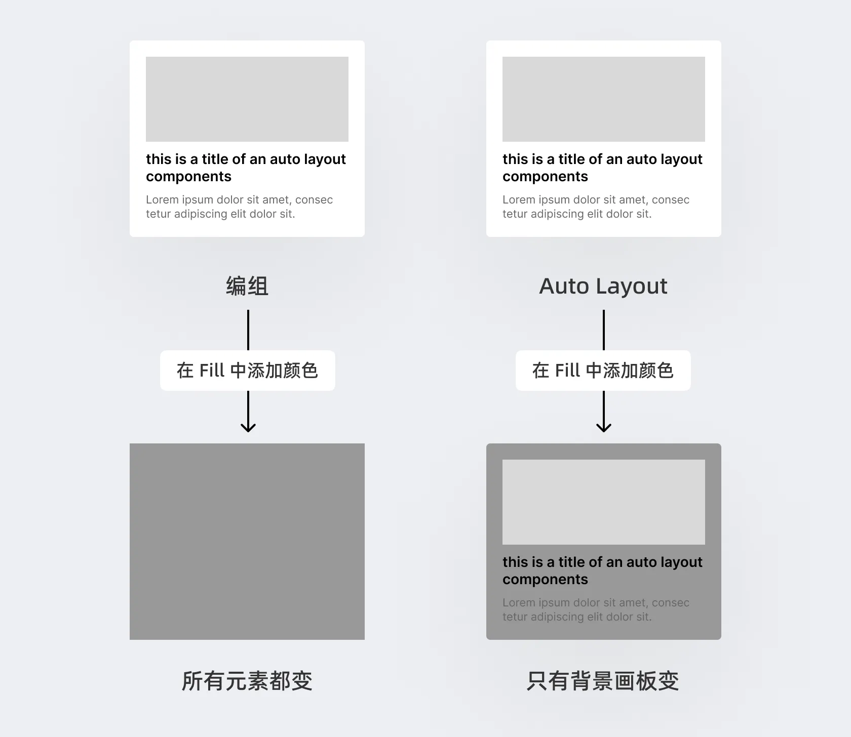 要注意的是,自动布局编组层和画板Frame的编组层都是 —— 矩形的背景,它的样式位于整个编组的最下方。