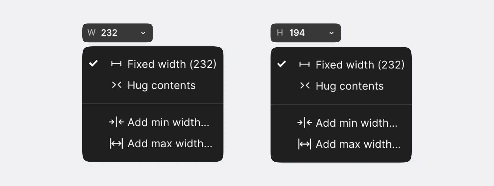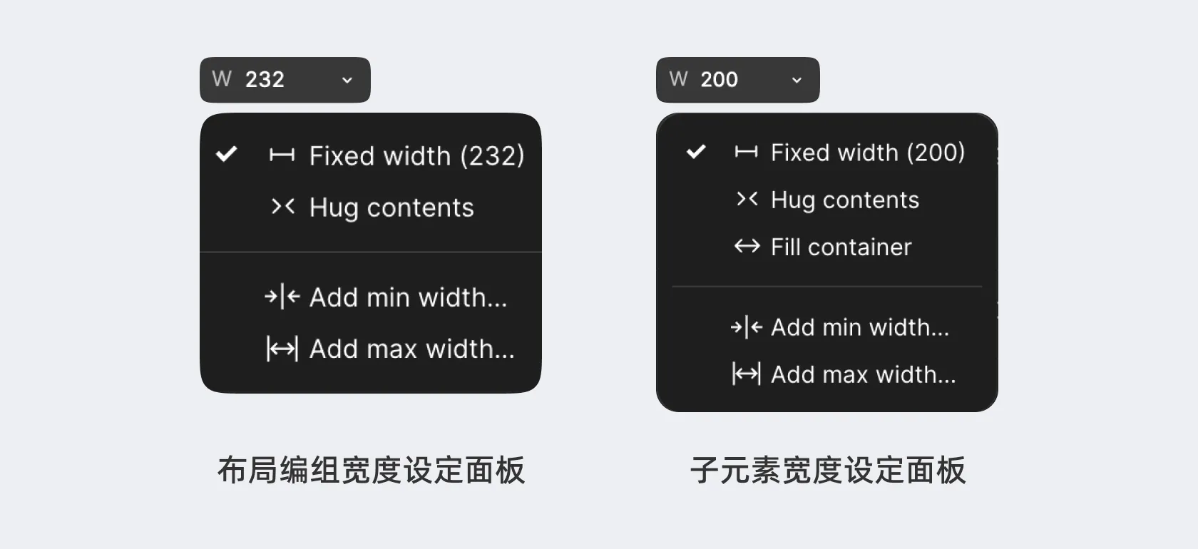 在创建自动布局后,布局编组的长宽属性就有了下拉选项,分别是: