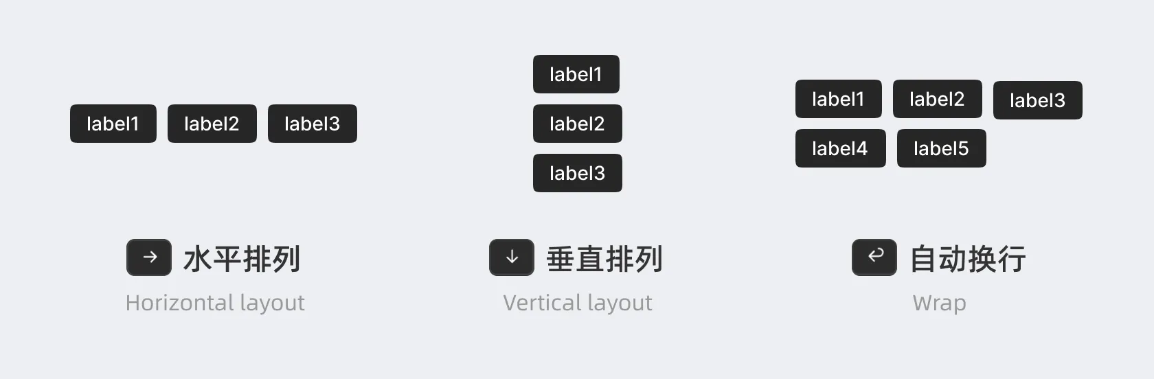 垂直排列vertical layout、水平排列horizontal layout、水平自动换行warp