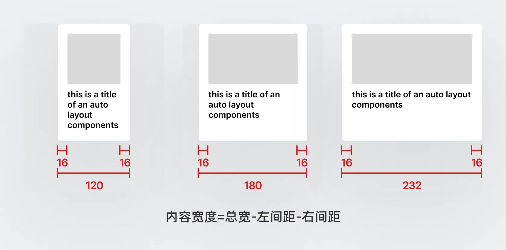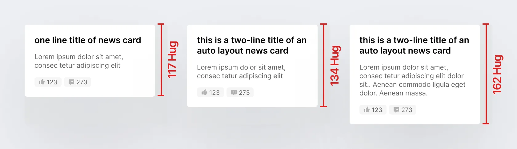 首先是父级编组随子元素适应,比如创建一个新闻列表中的卡片,卡片内包含标题、简讯、操作三个栏目并列,卡片高度会随内容的高度适应。那么卡片本身的高度设置为 Hug,下级内容为 Fixed 或者 Hug (文本框可用),则只需要完成内部元素的设计和排列,就能自动适应出最终得卡片高度。