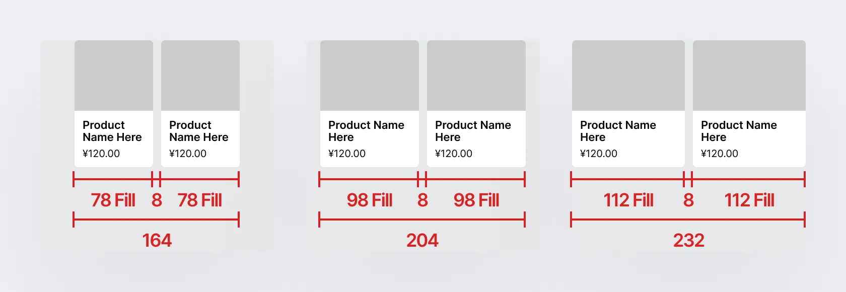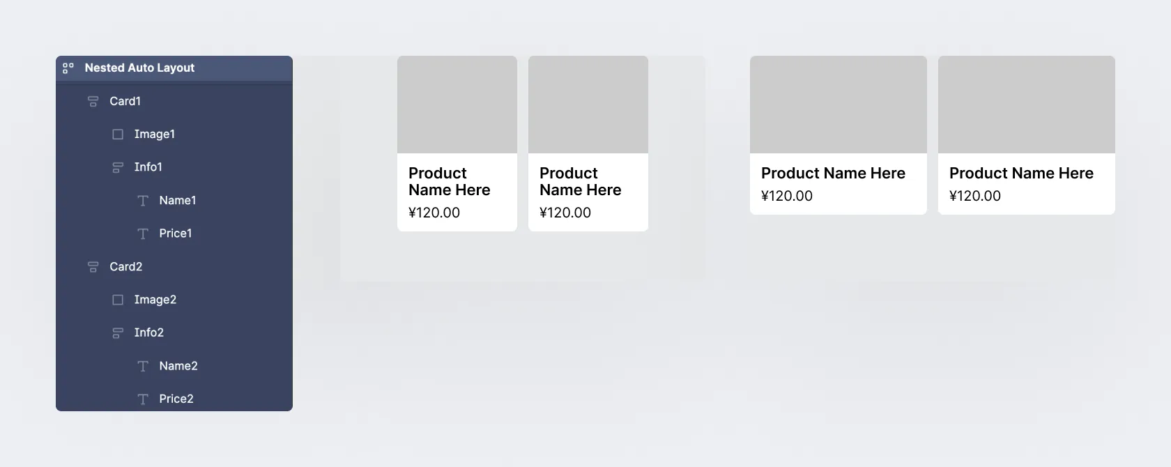 以及在上一小节中演示的双列商品卡片,左右两个卡片自然也可以使用自动布局。而卡片内下级包含图片和信息两个模块,图片只有一个图层宽度使用Fill即可,而信息模块则包含多个图层,可以继续使用自动布局创建,并将编组的宽度设置为 Fill。