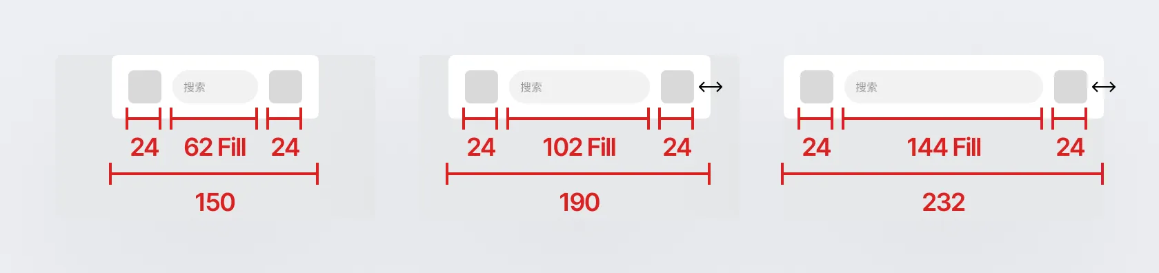 所以在这个场景中,左右两侧图标的宽度是 Fixed,而中间搜索栏的宽度是 Fill Container,那么实现的效果如下: