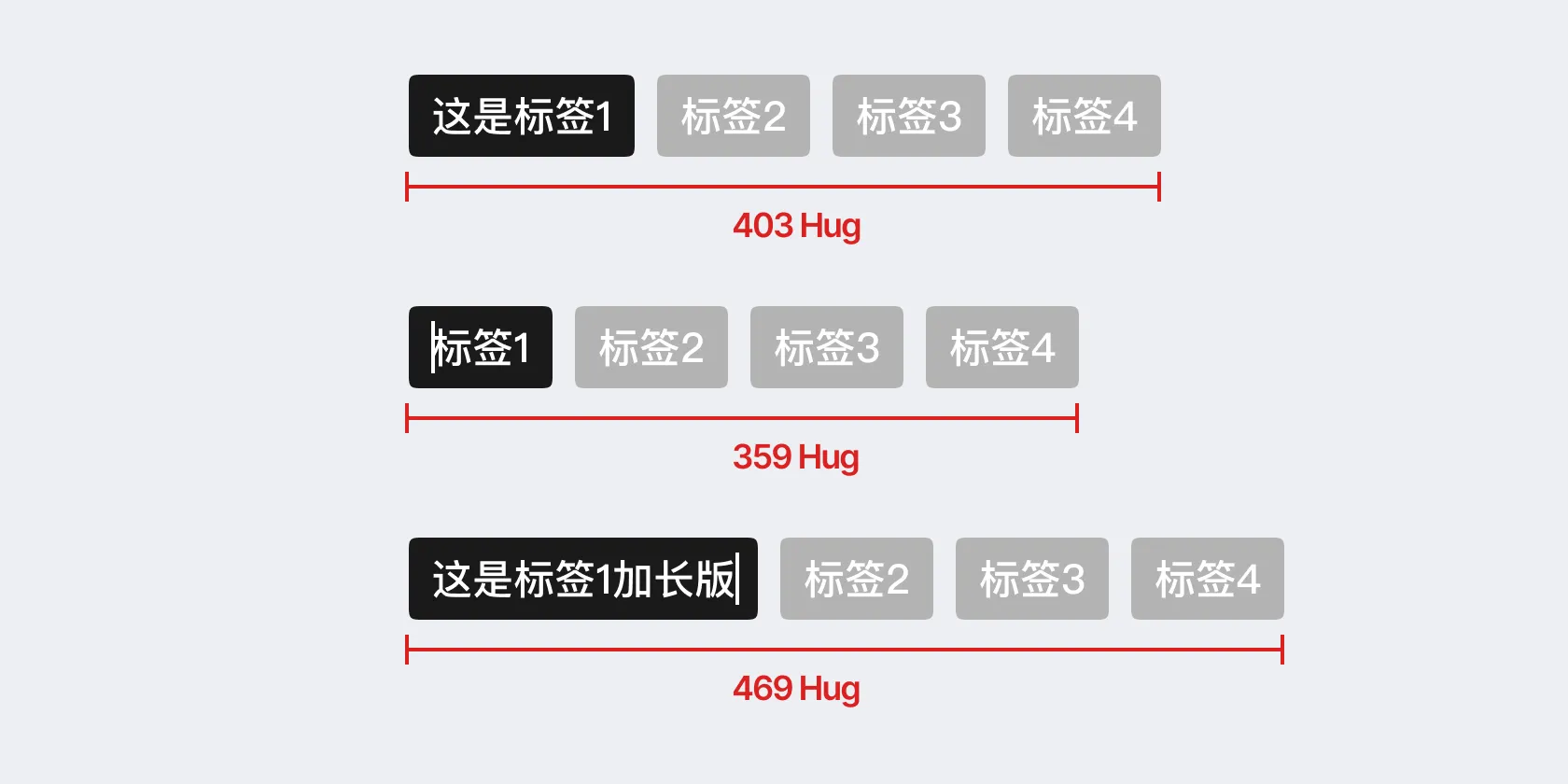比如做一个横向标签列表,自动布局得宽度为自适应 hug,它下级的每个标签可以由自动布局实现,且每个标签作为自动布局编组的宽度设置也为 hug。