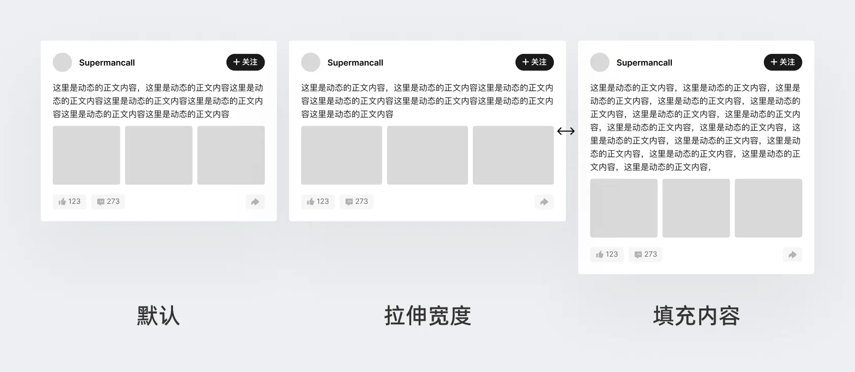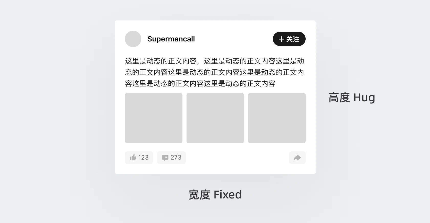 再比如一个完整的动态卡片,包含用户栏、内容栏、操作栏三个栏目,这个卡片的宽度会随场景调节,高度则根据内容适应,那么卡片的自适应编组宽度为 Fixed,高度为Hug。
