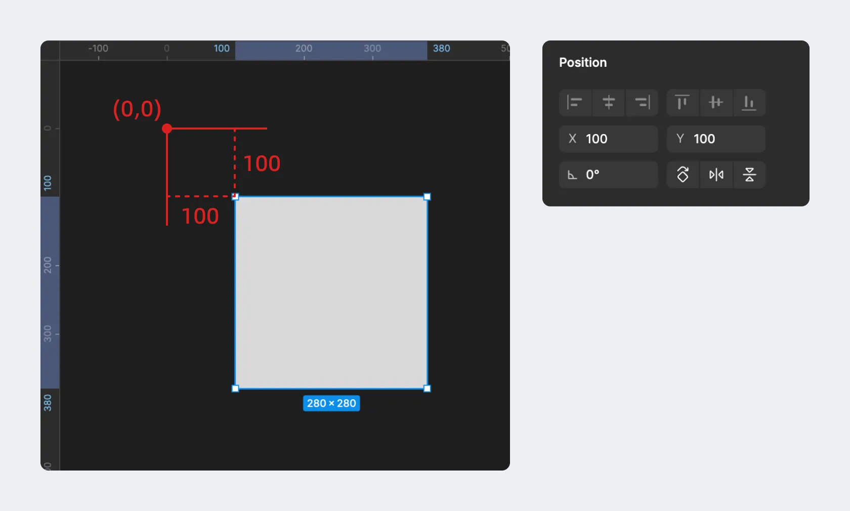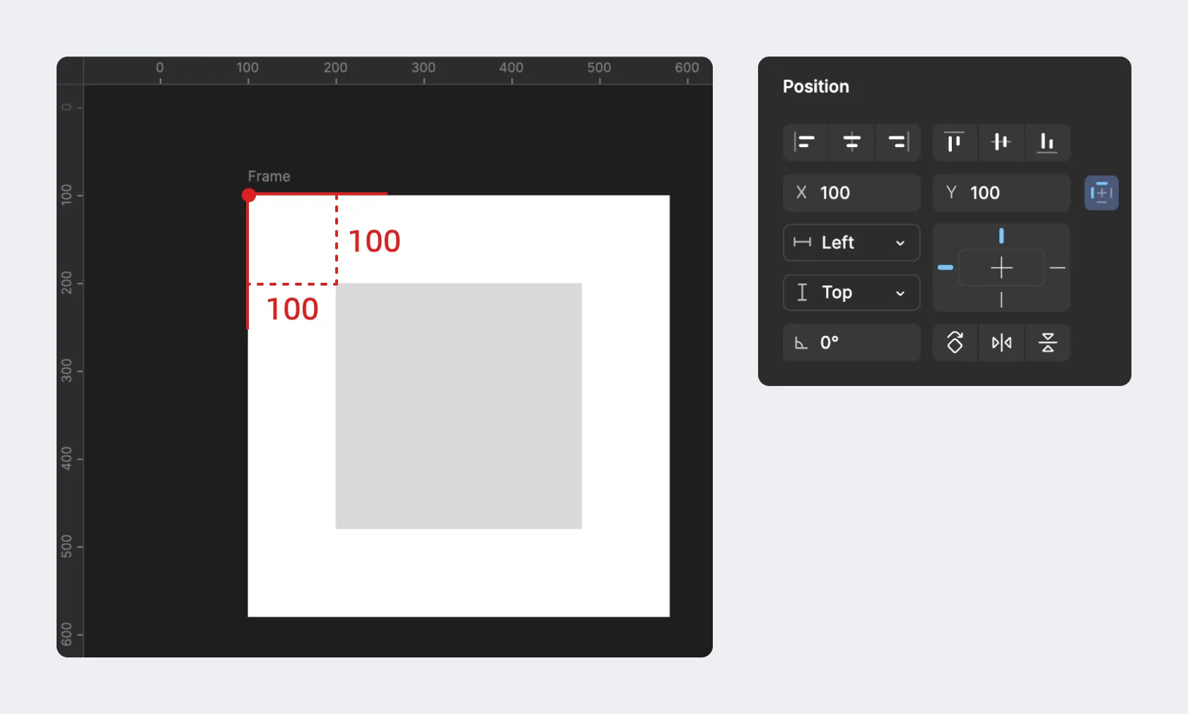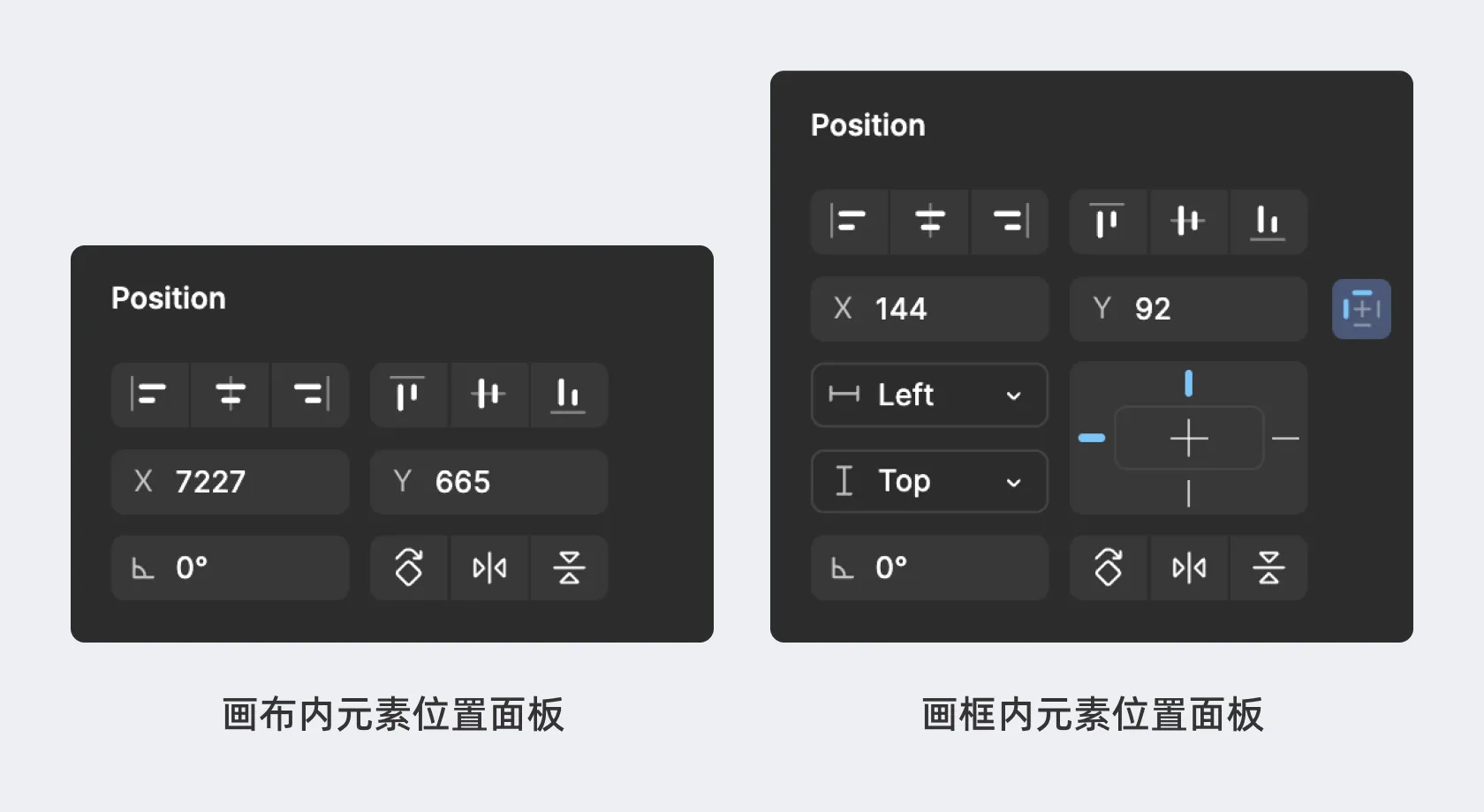 如果元素处于画框Frame内,那么元素的位置是元素左上角订单相对于上级画框的左上角顶点的 X、Y轴的距离,而不是相对于画布Page的世界坐标,且画板内会有更多关于响应式相关的设置。