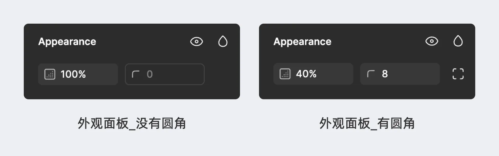 外观面板主要用来设置元素透明度、圆角、叠加模式。具有直角、锐角的图形支持圆角设置,矩形还可以单独设置四边圆角。而圆或不规则圆则不能进行圆角设置。