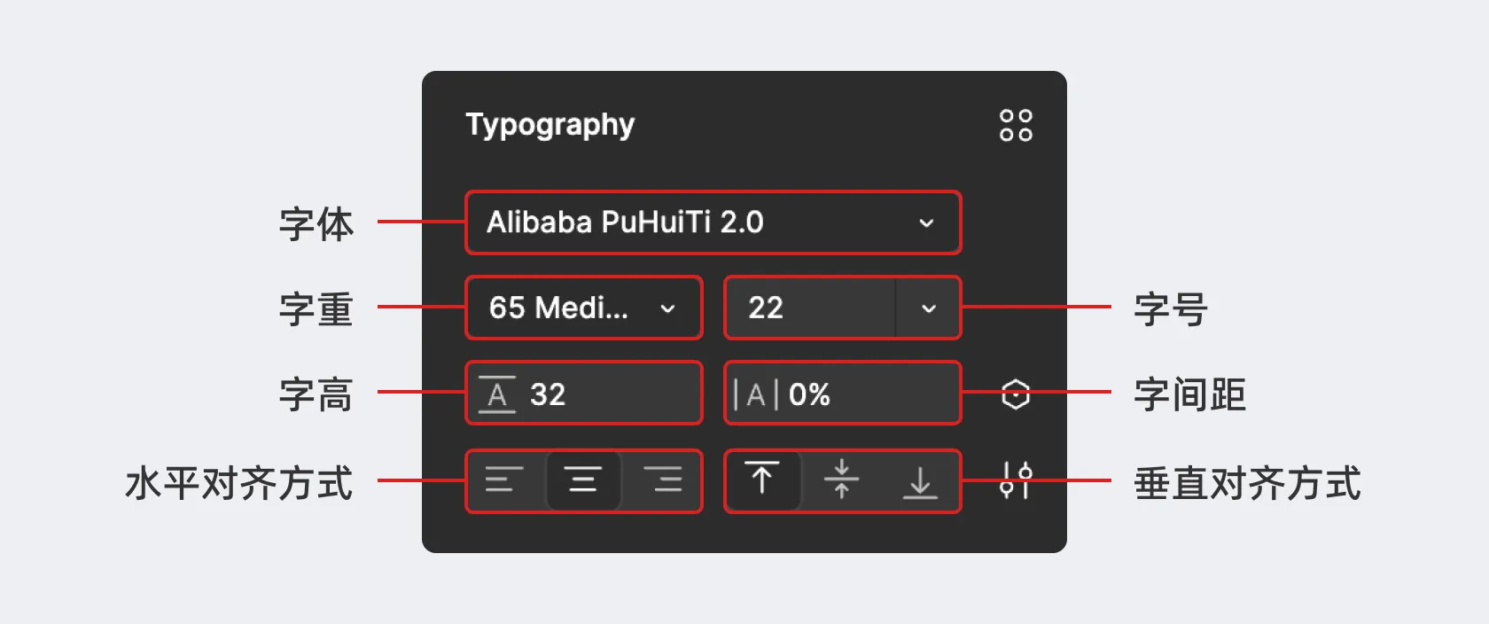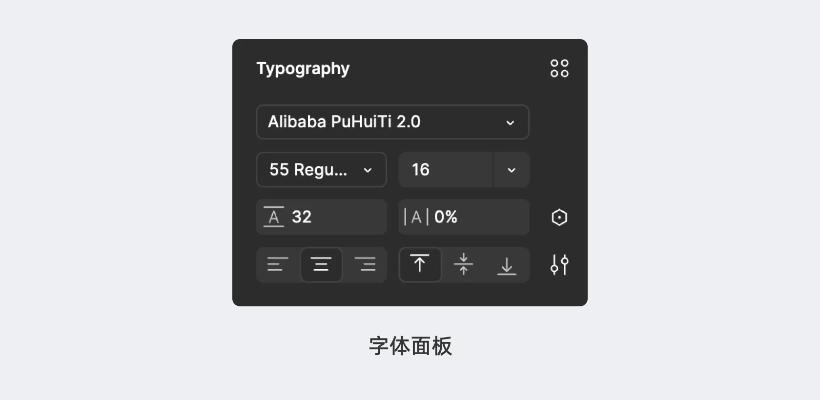 用于进行字体属性设置的面板,只有选中字体元素后才可以设置。因为字体相关设置的知识点较为复杂,我们会在后面对它做详细的解释。