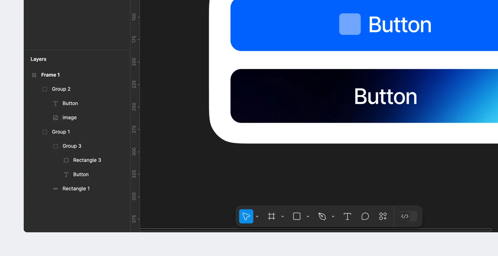- 视图作用:视图区域是一个开发概念,即元素需要置入到视图内才会被系统渲染显示出来。在 Figma 中,我们需要用 Frame 创建界面的画板,只有内容被置入到 Frame 中,才能在演示模式下被显示出来,反之则不显示。