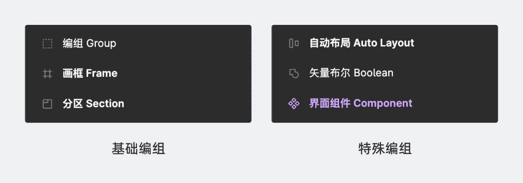 在 Figma 中,编组的类型有好几种,可以分成两个大类: