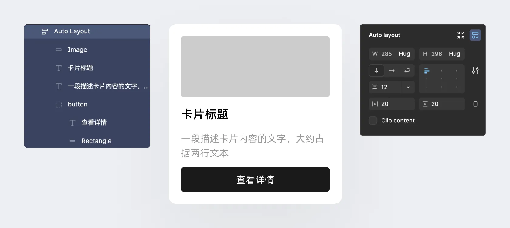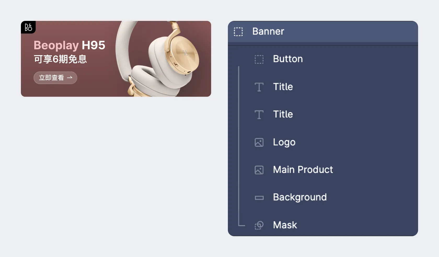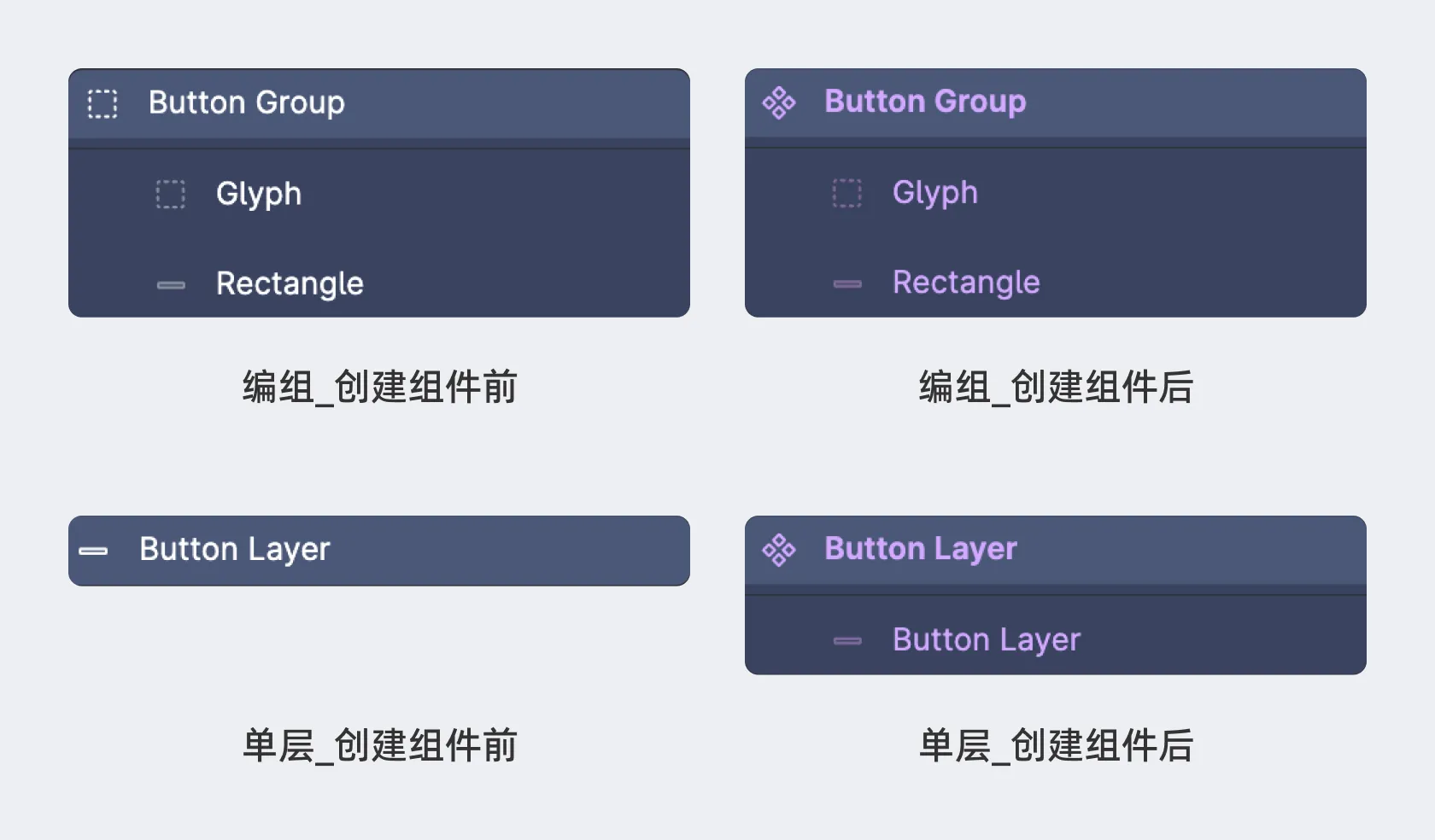 界面组件编组,则是 Figma 中的组件 Component 应用后的结果。如果直接使用 Group、Frame 创建组件,那么这些基础编组会直接被替换成组件编组,如果只有一个图层创建组件,则它会新建一个组件编组将原有图层置入下级。