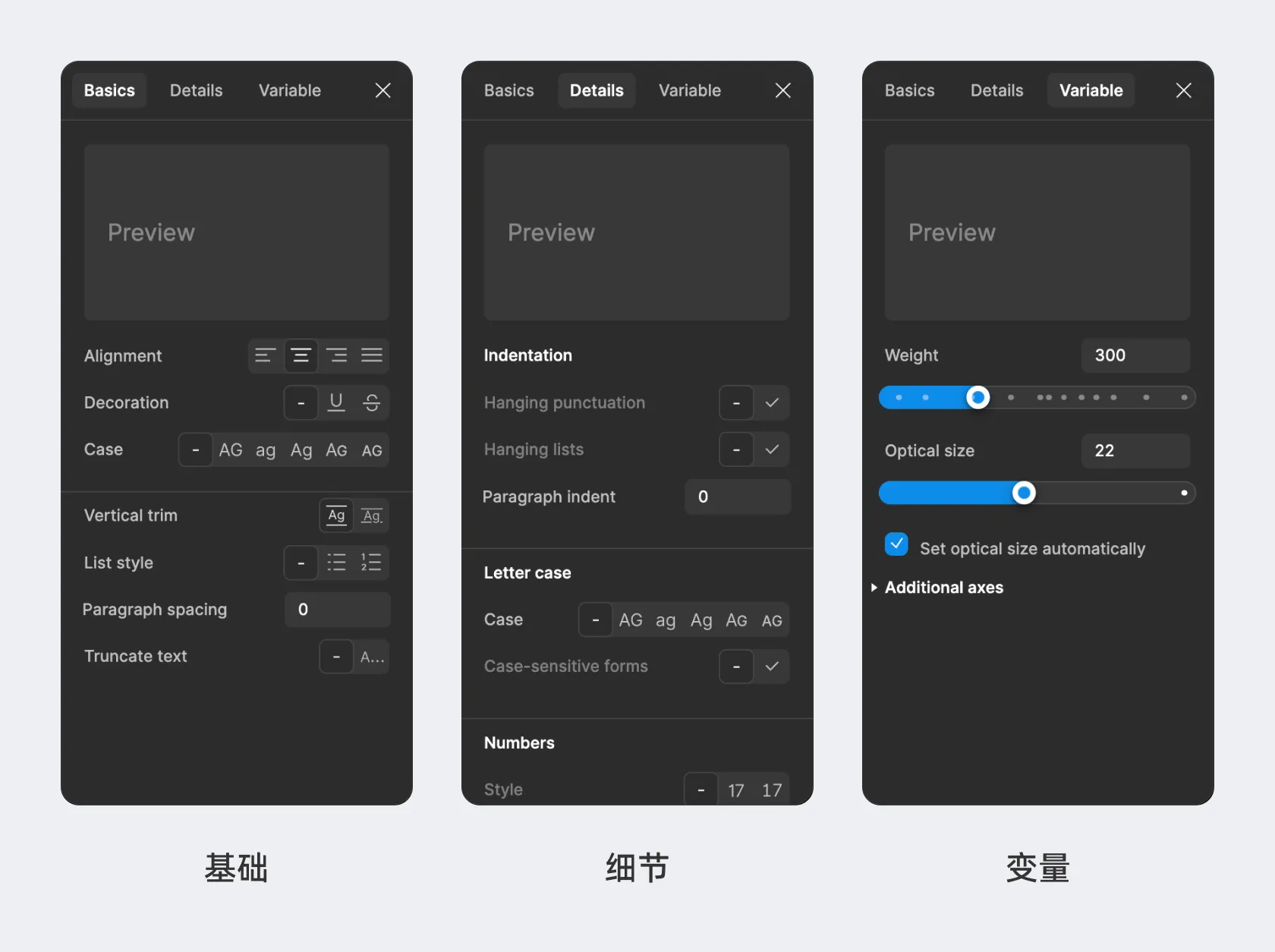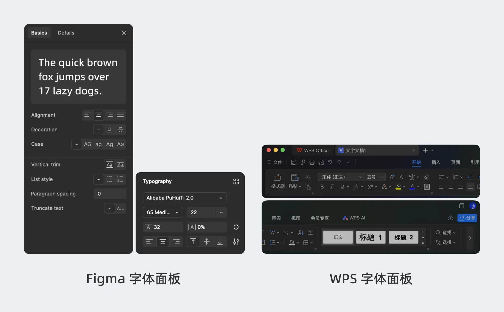 Figma的字体模块是属性面板内设置属性最多的一个模块,而它的设置和传统的办公软件 Word、WPS 等有很大的不同。