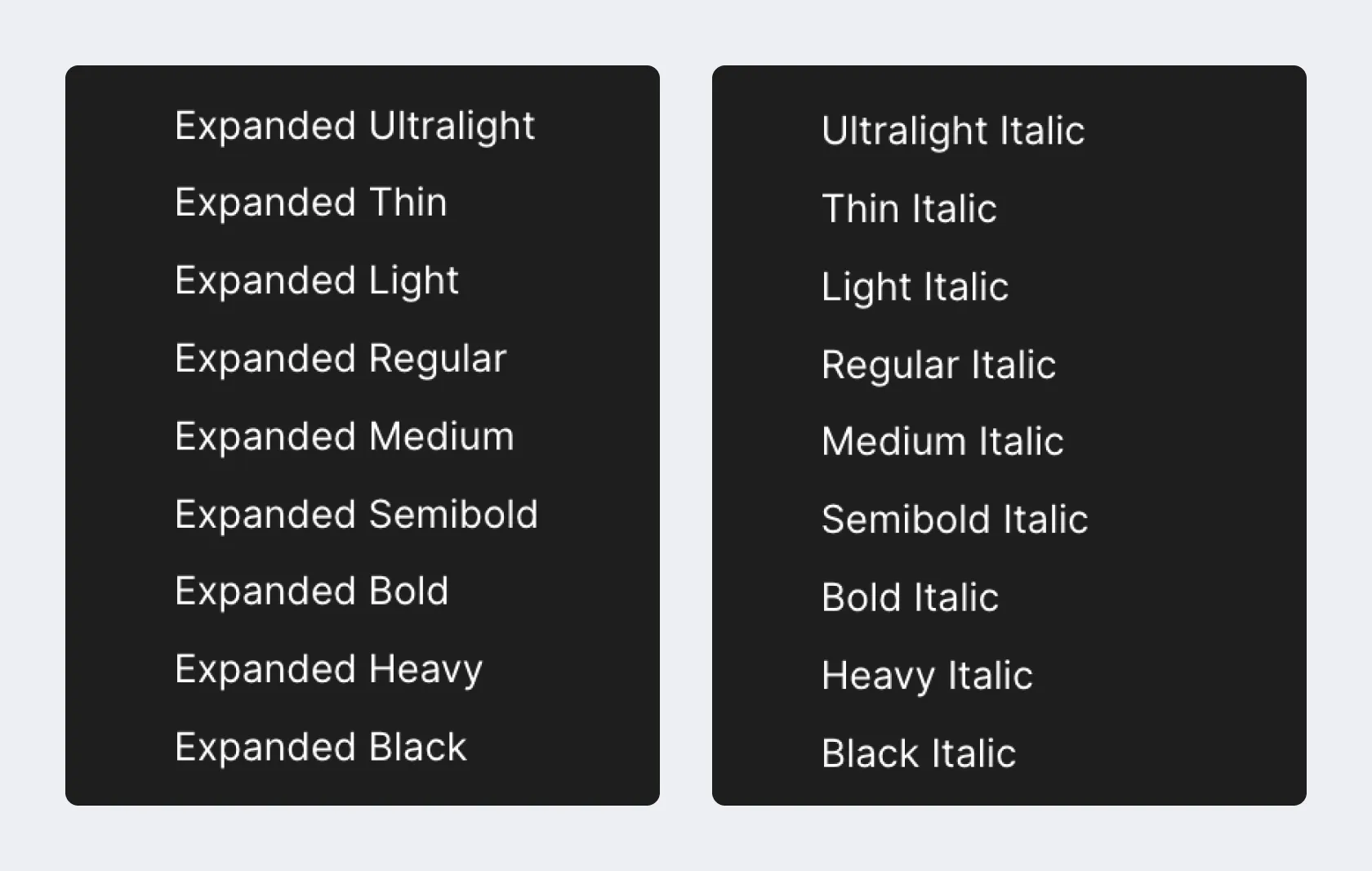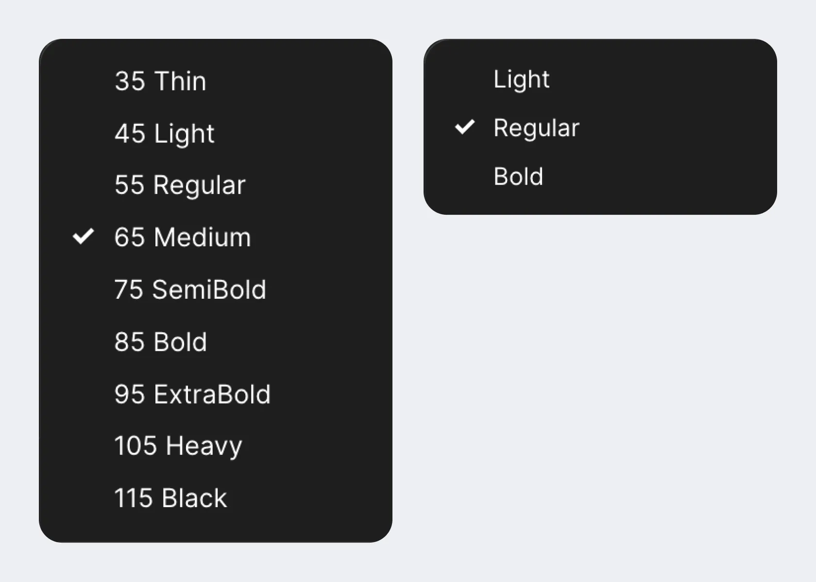 其中最特殊的就是 Variable Fonts,因为传统字体的字重调节,是要安装一个字体的不同字重字体文件,装几个字重就能选几个,没装就没有。
