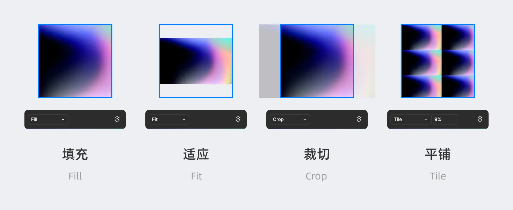 用于对所选元素区域进行填充设置的面板,可以选择填充不同色彩类型或图片。
