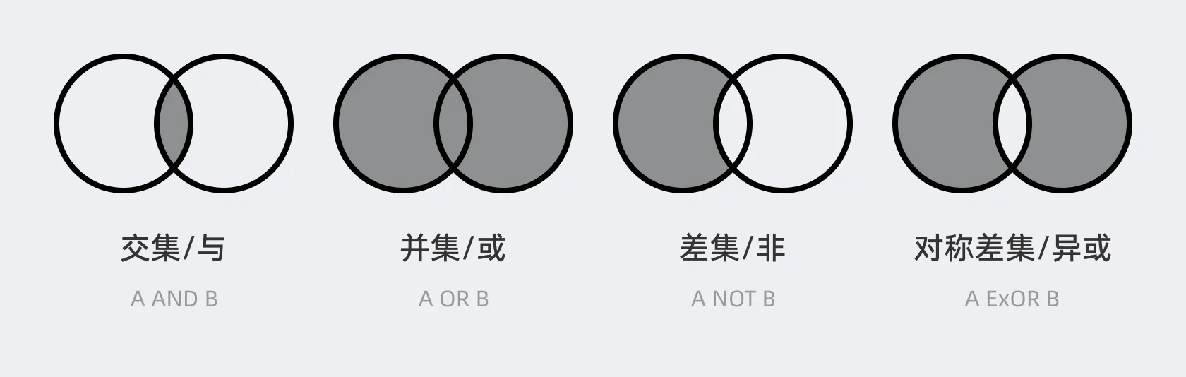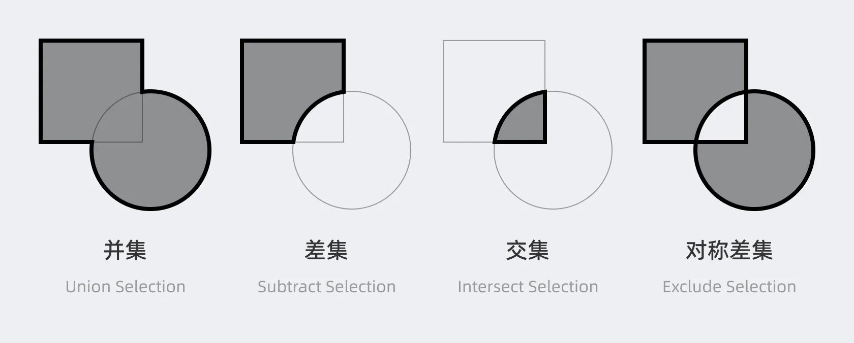 注:在一些 Figma 汉化插件中,会出现将对称差集混淆成差集的现象,对应解释以本知识库的翻译和概念为准。