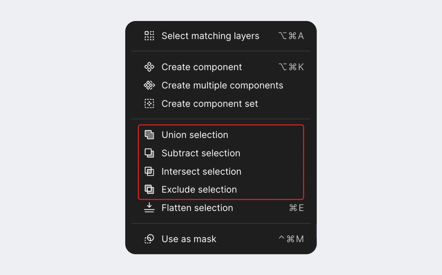 所以,Figma 在布尔运算下方提供了一个合并图层 Flatten Selection 的功能,选中布尔运算编组后再使用该功能,就可以对下级图层进行清空,将布尔运算编组转化为普通的矢量图层。