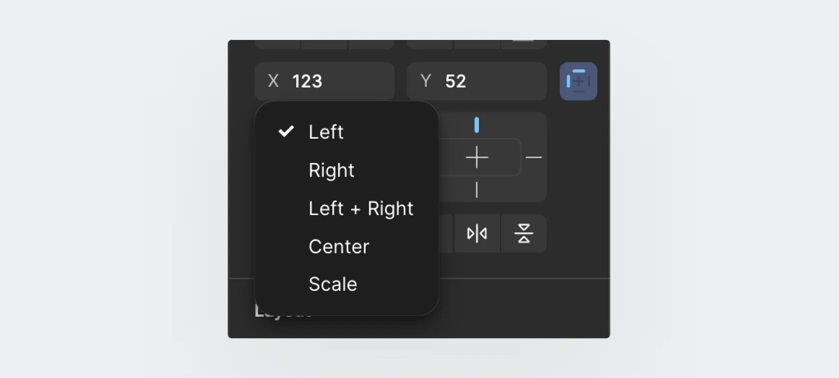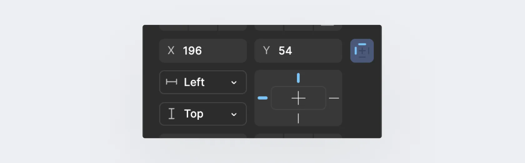 约束功能分别控制元素水平和垂直两个方向的布局,且布局的模式会在右侧的田字格内表示出来。