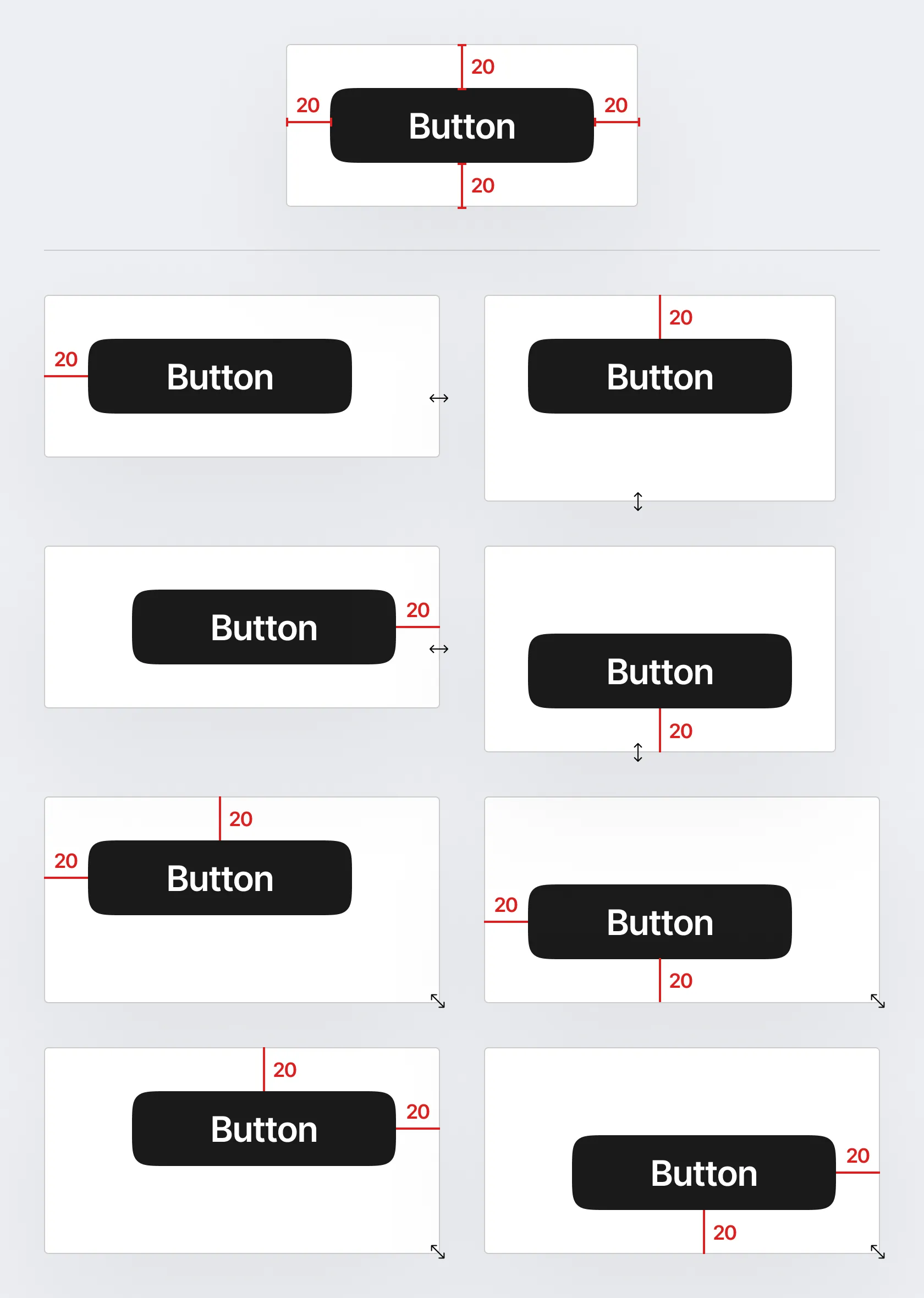 元素与上级 Frame在某方向保持间距一致,如上、下、左、右,以及左上、右上、左下、右下。