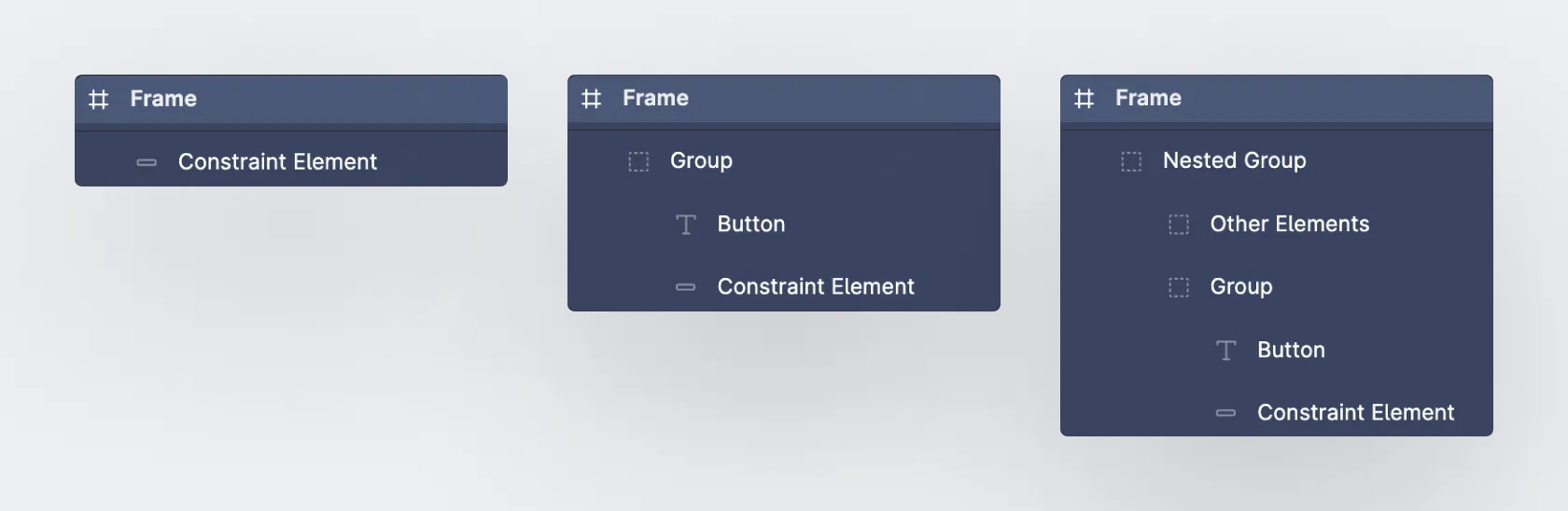 并且,约束是设置元素和 “上级Frame”的关系,即使该元素上级有别的编组(不管是几层),那么元素也依旧受到上一级 Frame的约束。比如下面三种情况,它们的约束是一致的。