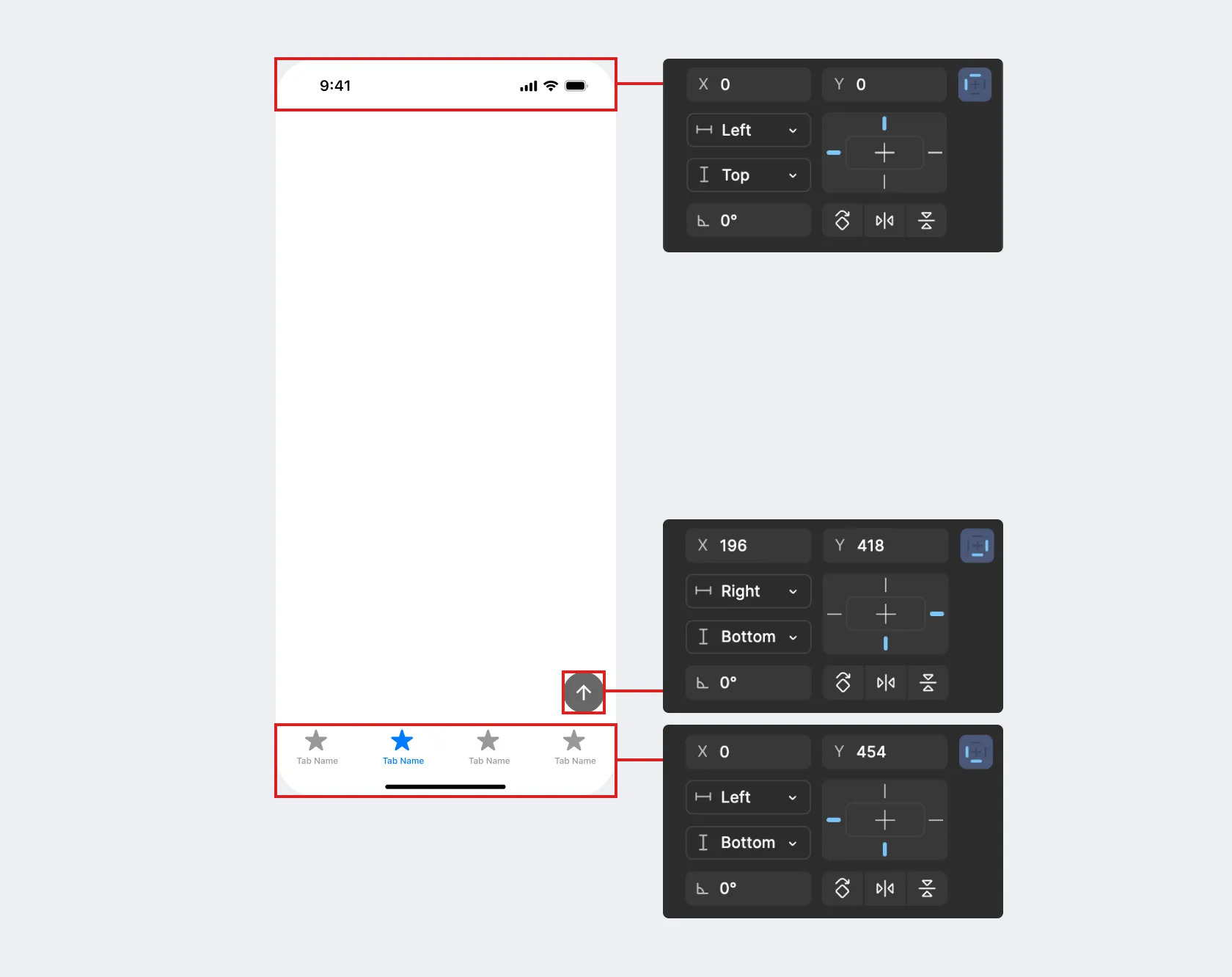 如APP界面设计中,顶部状态栏、底部指示器、导航都是会固定吸附在边缘的组件,所以可以给它们开启顶部、底部约束,类似客服、回到顶部等悬浮按钮,往往会使用右、下约束。